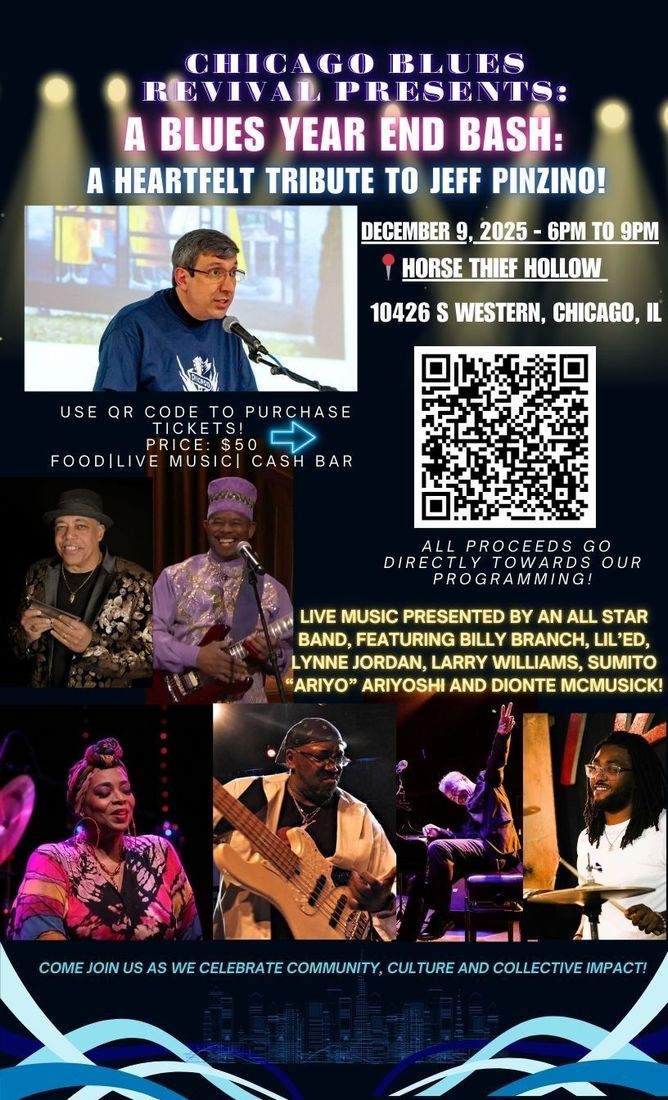 December 9th is shaping up to be a truly special evening! From 6–9 PM, we’ll gather at Horse Thief Hollow Brewing Co.in Beverly to celebrate the incredible legacy of Jeff Pinzino, the founder of Chicago Blues Revival! Jeff’s vision and passion have shaped so much of who we are today, and we’re excited to lift him up with joy, gratitude, and community as he transitions out of his role.